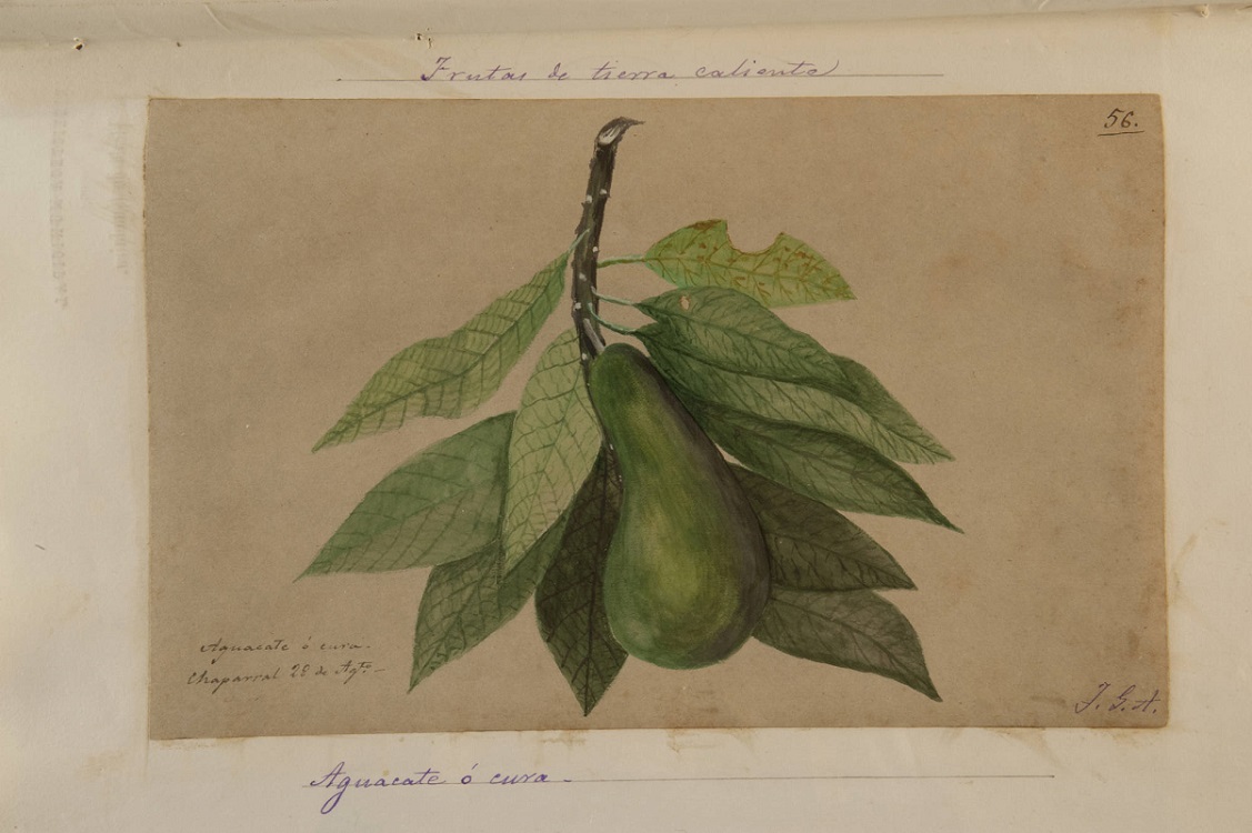 El español José Gutiérrez observa aguacates en cercanía a Vélez (Santander) en 1872, y cerca de Chaparra (Tolima) donde realiza una acuarela del fruto [LII]Gutiérrez de Alba. J. 1872 Diario de viaje. Excursión al Norte. En: Impresiones de un viaje a América (1870-1884). Banco de la República. https://www.banrepcultural.org/impresiones-de-un-viaje/index.php?r=manuscrito%2Findex