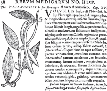 El Tlilxóchitl o vainilla también aparece en el documento de Francisco Hernández donde se ilustra y menciona la forma de sus hojas, su habito de crecimiento creciendo apoyado sobre árboles y su florecimiento en primavera, también menciona su uso en una bebida medicinal de cacao con otra planta llamada Mecaxochitl.