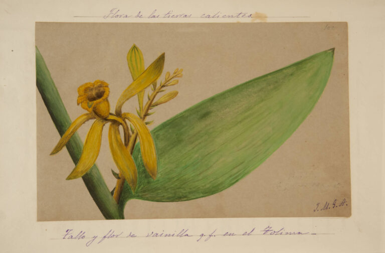 En 1872, el español José María Gutiérrez de Alba, realiza una ilustración de una vainilla que encuentra en el Tolima que titula “Tallo y flor de vainilla en el Tolima” y menciona que puede ser objeto de cultivo y aprovechamiento lucrativo como sucede en México[XXXIV]Gutierrez de Alba. J. Diario de viaje. 1873. Excursión al Caquetá. En: Impresiones de un viaje a América (1870-1884). Banco de la República. https://www.banrepcultural.org/impresiones-de-un-viaje/index.php?r=manuscrito%2Findex.