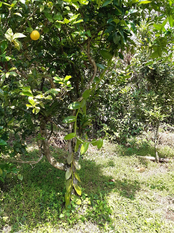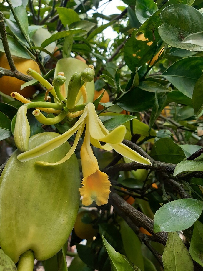 Fotografía de vainilla pompona creciendo sobre un de árbol tutor de naranja que además ofrece sombrío (2022). Fotografía de lianas de vainilla sobre tronco de naranja, se detallas dos vainas de vainilla (2022) y flor de vainilla lista para ser polinizada. Fotografías tomadas en Tibacuy Cundinamarca por J. Borbón.